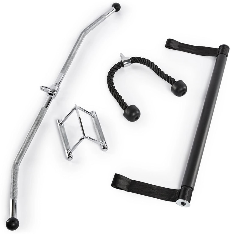 Includes training accessories such as lat pull-down bar, rowing handle, tricep rope and straight bar for squats.
