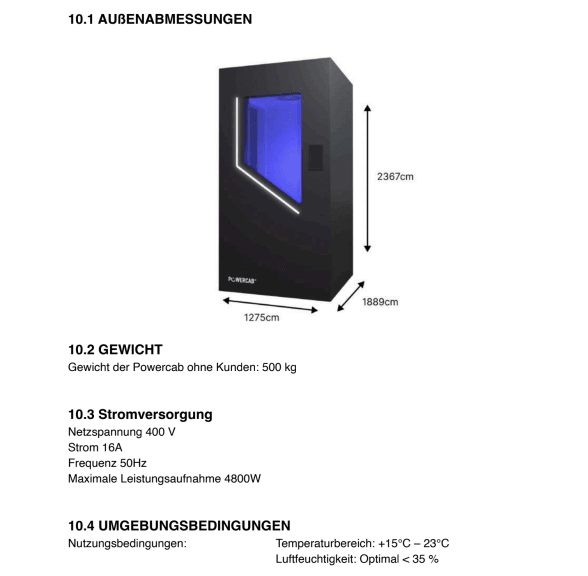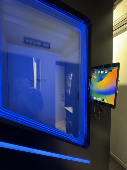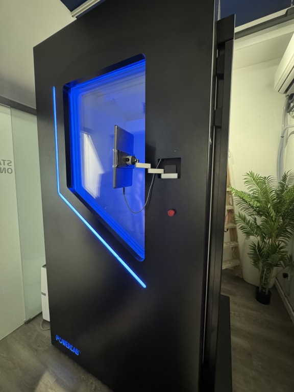 The Powercab is an electric device that enables whole-body cryotherapy (WBC). The client is placed in a closed chamber where dry cold is generated by a refrigeration unit. Within this chamber, the client's entire body is exposed to the cold. The Powercab ensures the recording, control, monitoring, and traceability of the various application parameters. It features numerous sensors for optimal operation, including temperature and humidity, as well as a dedicated data acquisition interface.