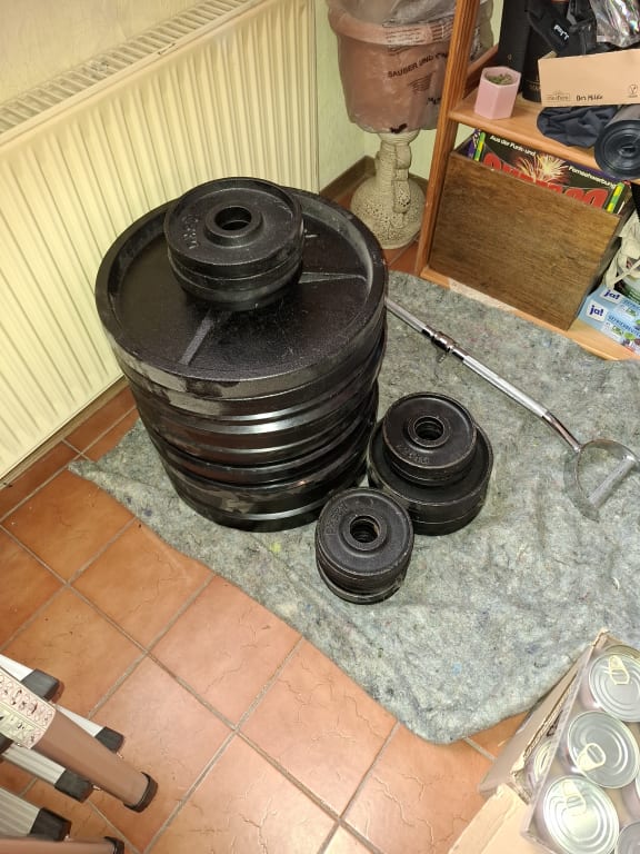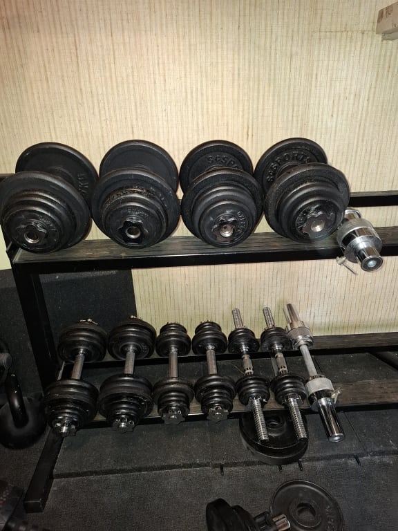 50mm cast iron plates (85 kg): 2x20kg | 4x5kg | 4x2.5kg | 12x1.25kg.