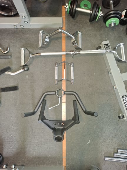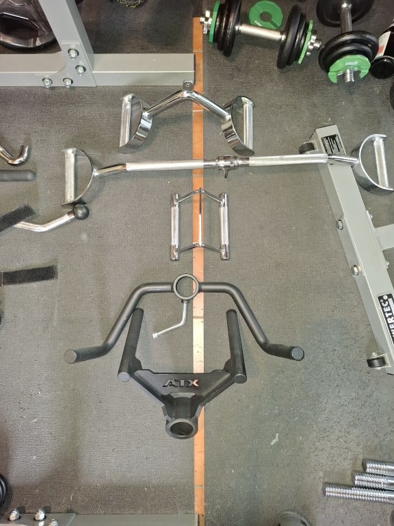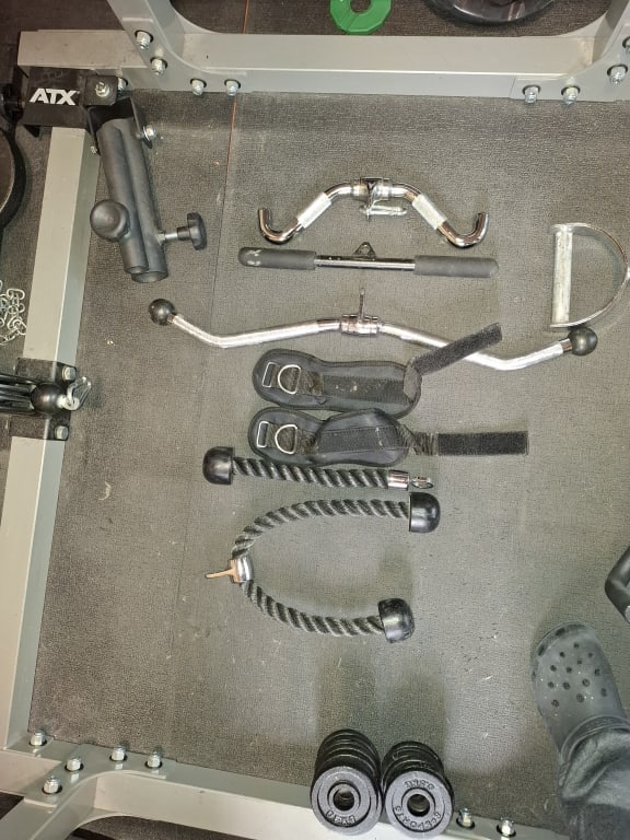 Special handles: 3x parallel handles, 3x T-bar handles (+ ATX landmine attachment), various triceps and curl handles. Triceps and curl handles, ropes, leg straps and sufficient fasteners.